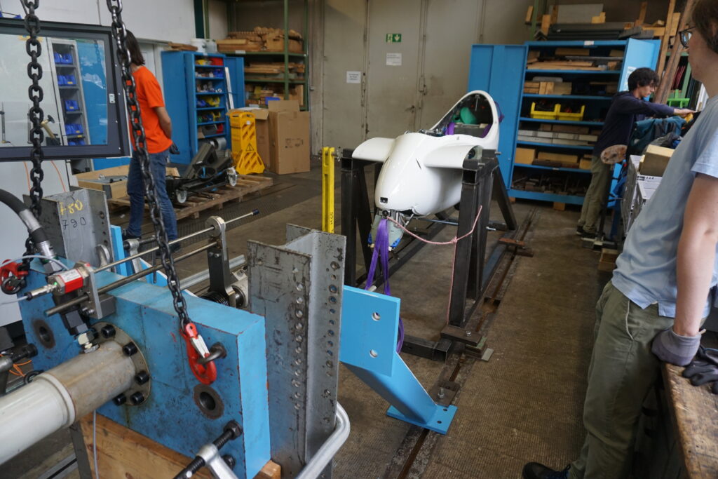 Für den Versuch wurde der Rumpf der AK-X in das Belastungsgestell, welches bereits für den Rumpfbelastungsversuch letzten Jahres verwendet wurde, eingespannt. Durch Drehen der Vorrichtung, konnte so die Belastungsrichtung variiert werden. Auch der Belastungswinkel konnte dabei variiert werden, um unterschiedliche Start- und Flugzustände nachzustellen.