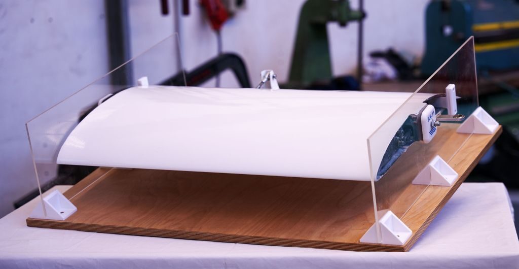 In den letzten zwei Monaten ging die Arbeit am Demonstratormodell weiter voran. Die Schalen sowie der Holm, der allerdings nur als Mock-up dient, wurden fertiggestellt. Da in der bereits weitgehend gebauten, ursprünglich geplanten Steuerung Fehler festgestellt wurden, musste diese leider noch einmal neu konstruiert und gefertigt werden. Alle Teile der neuen Steuerung sind inzwischen hergestellt und somit bereit für den finalen Einbau. Auch das hintere Ruder wurde bereits laminiert und lackiert, und die Ruderscharniere wurden in den Flügel eingeklebt. Auch die Bogenführung welche als Lagerung für die Vorderkantenklappe dient, wurde von einer externen Firma gefräst und ist Bereit für den Einbau.
